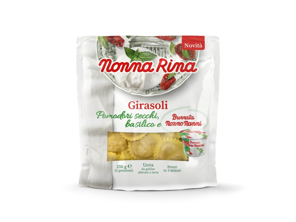 Rina Girasoli Burrata s pomodori secchi od Nonno Nanni je lahodný italský sýr, který kombinuje krémovou burratu s jemně nasládlými sušenými rajčaty. Každá porce nabízí autentickou chuť Itálie – bohatou, krémovou a aromatickou.