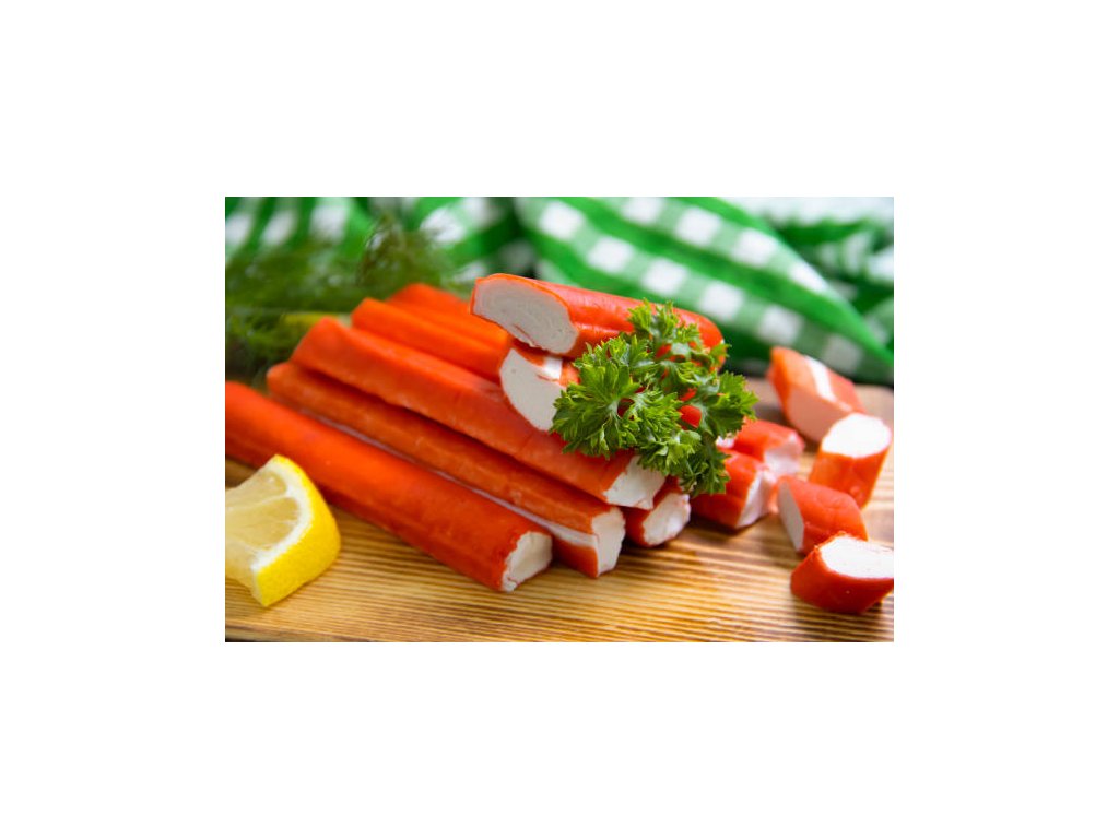 voda, surimi(rybí maso 40%, stabilizátory: sorbitol E420,E451, cukr), škrob (obsahuje lepek), cukr, sůl, extract kraba, palmový olej, sójové proteiny, crabová mouka, vaječná mouka, barviva E120, E160c.