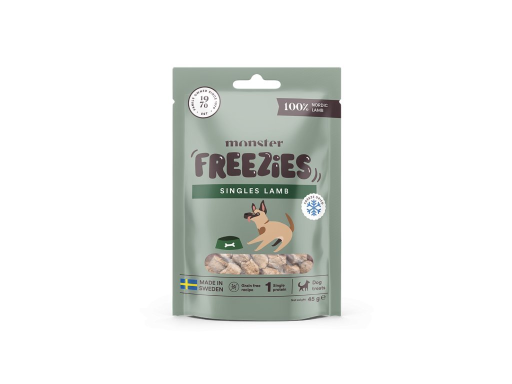 Dopřejte svému psovi chutnou a kvalitní odměnu v podobě Monster Dog Treats Freezies Jehněčí 45 g. Tyto prémiové lyofilizované pamlsky jsou vyrobeny z kvalitního jehněčího masa, které si díky šetrnému procesu sušení mrazem zachovává přirozenou chuť, vůni i důležité živiny.