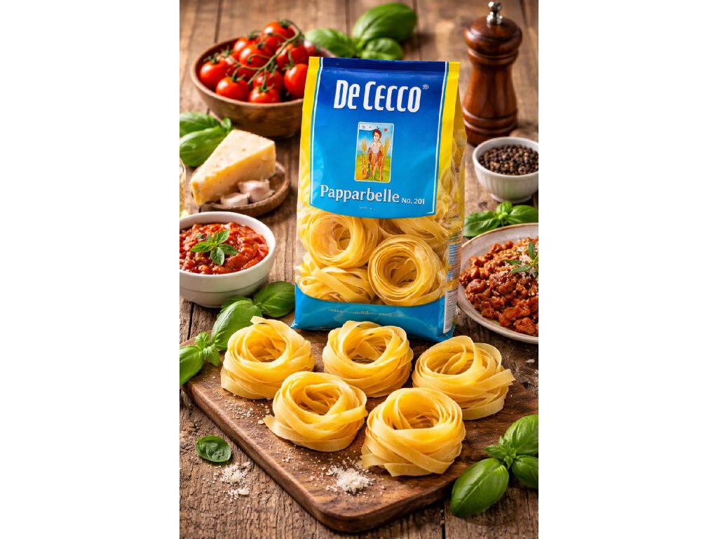 Poznejte skutečnou italskou tradici s pappardelle n.201 od De Cecco – klasickými širokými dlouhými těstovinami, které byly po generace oblíbené po celé Itálii. Tyto těstoviny jsou vyrobeny z tvrdé pšeničné krupice (semoliny), která jim dává charakteristickou pevnost, výbornou texturu a schopnost udržet omáčku v každém pramínku.