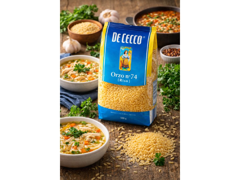 Poznejte De Cecco Riso / Orzo n° 74 – malé zrnité těstoviny z tradiční italské produkce, které připomínají malá zrnka rýže a skvěle se hodí zejména do polévek a vývarů.