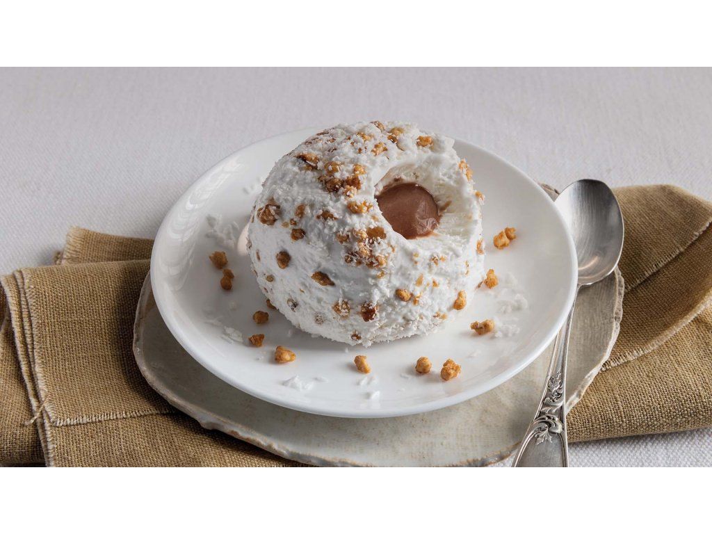 Uvnitř se ukrývá jemná kokosová zmrzlina doplněná o krémové oříškové tóny, které společně vytvářejí harmonickou a vyváženou chuť. Povrch dezertu je jemně strukturovaný a podtrhuje jeho prémiový charakter i typický italský styl.